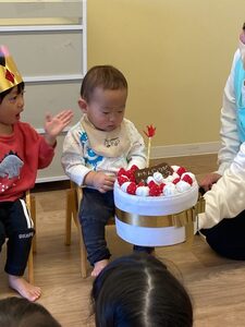 めばえ組のお友達は大きなケーキにちょっぴりびっくりしたかな😊