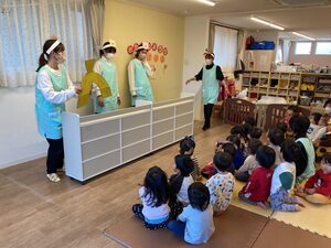 先生からの出し物は、「3びきのこぶた」の劇でした。おおかみがやって来て、わらと木の家が吹き飛ばされてびっくり‼ みんな真剣に見ていました😊