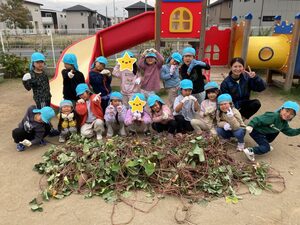 一番小さいめばえ組も参加しました。お芋に触るのが初めてかな?お芋に触るのがちょぴりこわいお友達もいましたよ😄掘ったお芋は顔ぐらい大きいね。