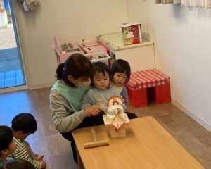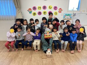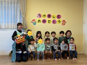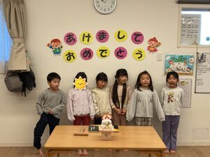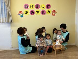 鏡開きが出来たらめばえ組は鏡もちと一緒に写真を撮りました。ちょっとカメラマンに人見知りで涙😢でした。