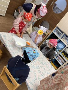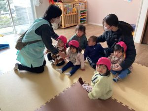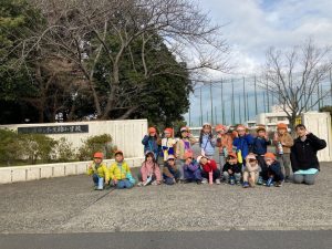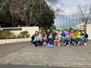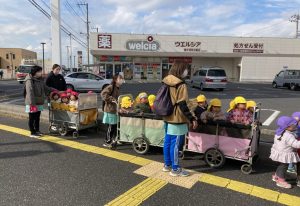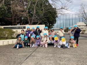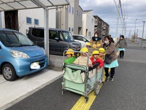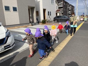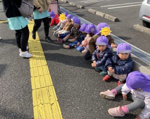 今日は、地震の避難訓練でした。0・1・2児歳は、駅前通りまで。3・4・5歳児は、第2避難場所になっている奈良輪小学校まで避難しました。