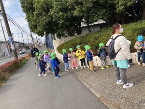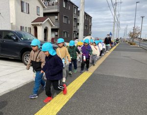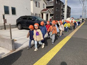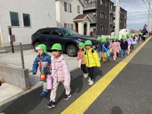 園外へ避難します。避難訓練なので少し速足で歩きます。小さいクラスのみんなも頑張って歩きました。