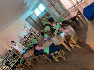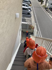 3・4・5歳児は、2階からの避難です。サイレンが鳴ると机の下に入って、揺れが収まったら外の階段をおります。