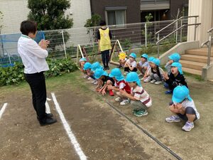 市役所の交通安全課の方が来て、道路の歩き方を教えてくれました。今までの交通安全教室で教えてもらった事を覚えているお友達もたくさんいました。