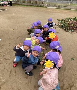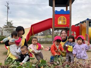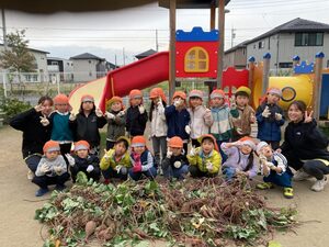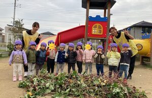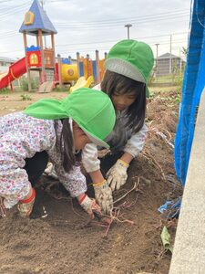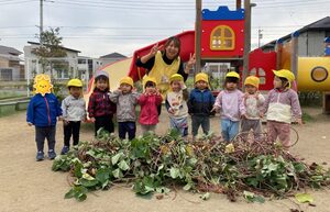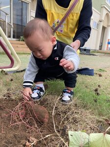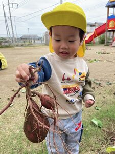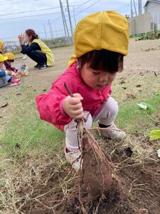 一番小さいめばえ組も参加しました。お芋に触るのが初めてかな?お芋に触るのがちょぴりこわいお友達もいましたよ😄掘ったお芋は顔ぐらい大きいね。