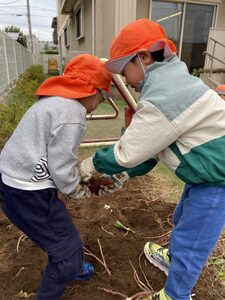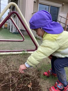 つばさ組は、軍手をつけてがんばって掘ります。お友達と力を合わせて掘ってみよう!