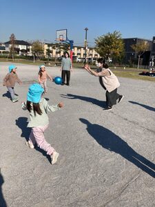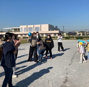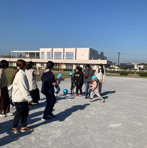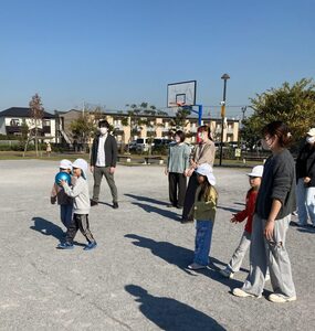 公園の広場でドッチボールもしました。最初は、おうちの人も一緒のチームで対戦しました。みんな頑張れ~!