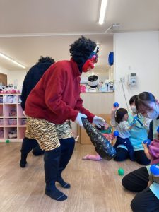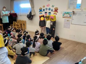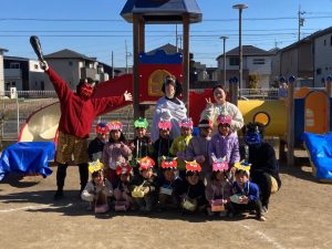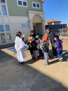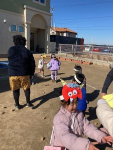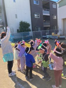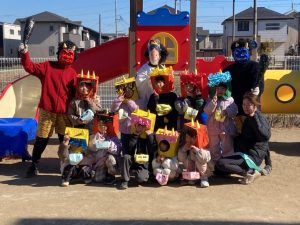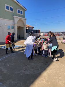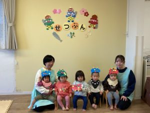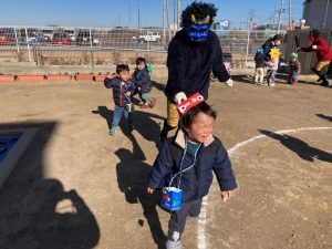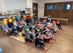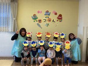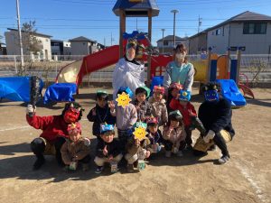 みんなで鬼のお面をかぶって、豆まきを頑張りましたね。最初怖かった鬼もみんなの頑張りに降参していました。これで今年一年元気いっぱいに過ごせそうですね。
