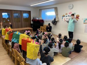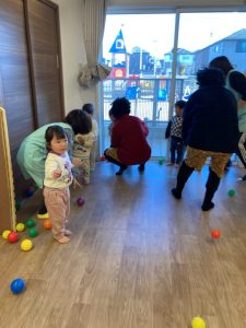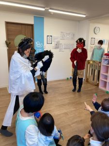 めばえ組とのぞみ組はお部屋で豆まきをしました。やって来た鬼にびっくり!