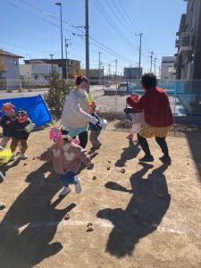 みのり組・つばさ組・かける組・ひかり組は園庭で豆まきをしました。