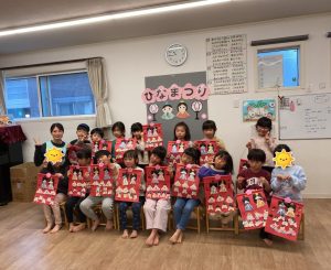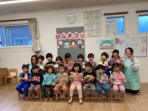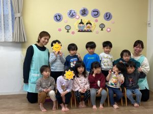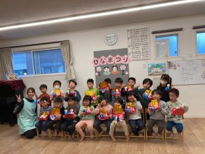 ひな祭りに製作した作品を持って、みんなで写真を撮りました。素敵なひな人形が出来ましたね✨✨