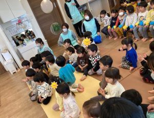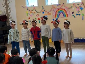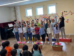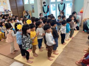 つばさ組は「たのしいね」の歌を歌いました😊手には可愛いお花をつけて、拍手をしたり、隣のお友達と手を合わせたりしながら元気いっぱいに歌ってくれました。