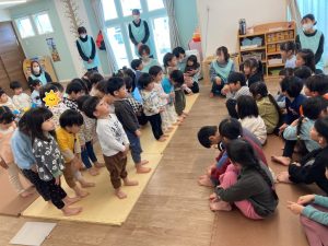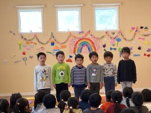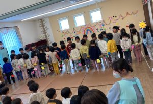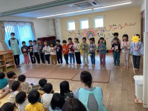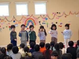 めばえ組・のぞみ組・みのり組のお友達は、「キラキラ星☆」の歌を歌ってくれました。手をきらきら✨✨とさせてとっても可愛く歌えました。ひかり組さんからも「かわいい~❣」という声が聞こえてきました😊