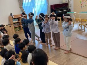 かける組は、カスタネット・タンバリン・すずで「どんぐりころころ」の曲を合奏してくれました。みんな息ピッタリの素敵な演奏でしたよ♬