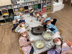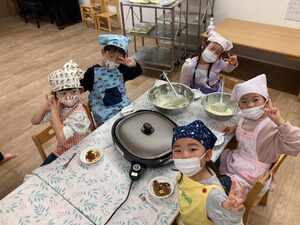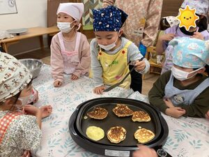 楽しみにしていたホットケーキ作りに、みんな大満足だったようです。今度はどんな食育活動になるかな?楽しみですね💕