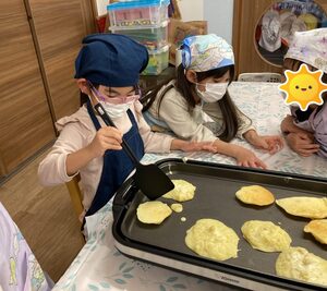 少しずつふっくらとしてくる生地を見て、「そろそろ焼けたかな?」「焦げちゃいそう、早くひっくり返そうよ。」と待ちきれない様子です。
