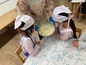 ホットケーキの生地には、お芋ほりで採れたさつまいもが入っています。どんなホットケーキになるか楽しみですね💕