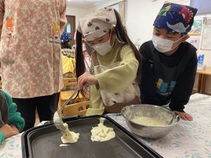 生地が混ざったら、ホットプレートにお玉で丸くのせていきます。なかなか難しいけれど、みんな上手ですよ😊