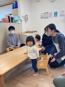 いつもは玄関でバイバイするおうちの人と一緒にお部屋に入って、あれ?いつもとはちがう…という表情のめばえ組さんでした。