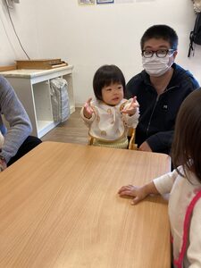 いつもやっている朝の会や朝のおやつをおうちの人と一緒にに座ってしました。手遊びや朝の歌が上手でしたね。お名前が呼ばれると「はい!」と手をあげられていました😊