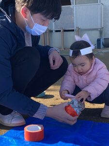 パパと一緒にテープをペタペタ、ボールが出来てきたね😊